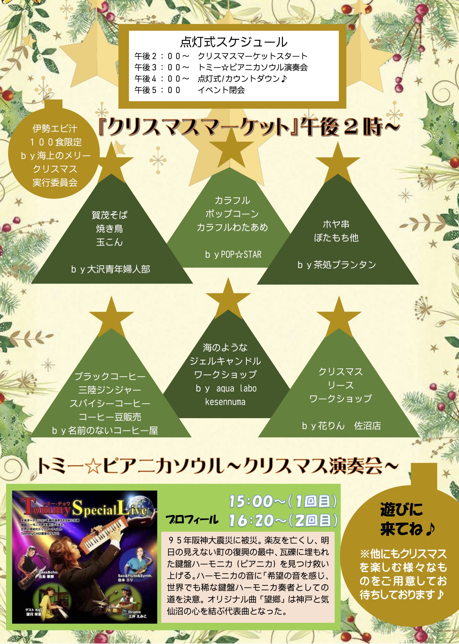 ในวันเปิดทำการวันที่ 12 ธันวาคม จะมีคอนเสิร์ตจากวงเปียโน "Tommy☆PiaNika Soul" และ "ตลาดคริสต์มาส" พร้อมร้านค้า 17 แห่ง! มันจะเป็นงานที่สนุกสนานที่จะนำสายลมที่ร่าเริงและอบอุ่นมาสู่ฤดูหนาวคาราคุวะ!