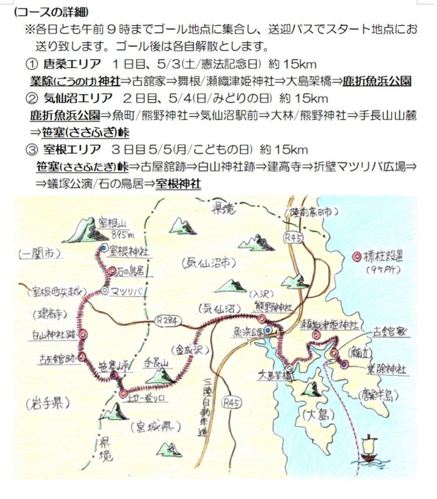 [สถานที่นัดพบ] ① สวนชิกาโอริ อุโอฮามะ ② ทางผ่านซาซาฟุตากิ ③ ศาลเจ้ามูโรเนะ