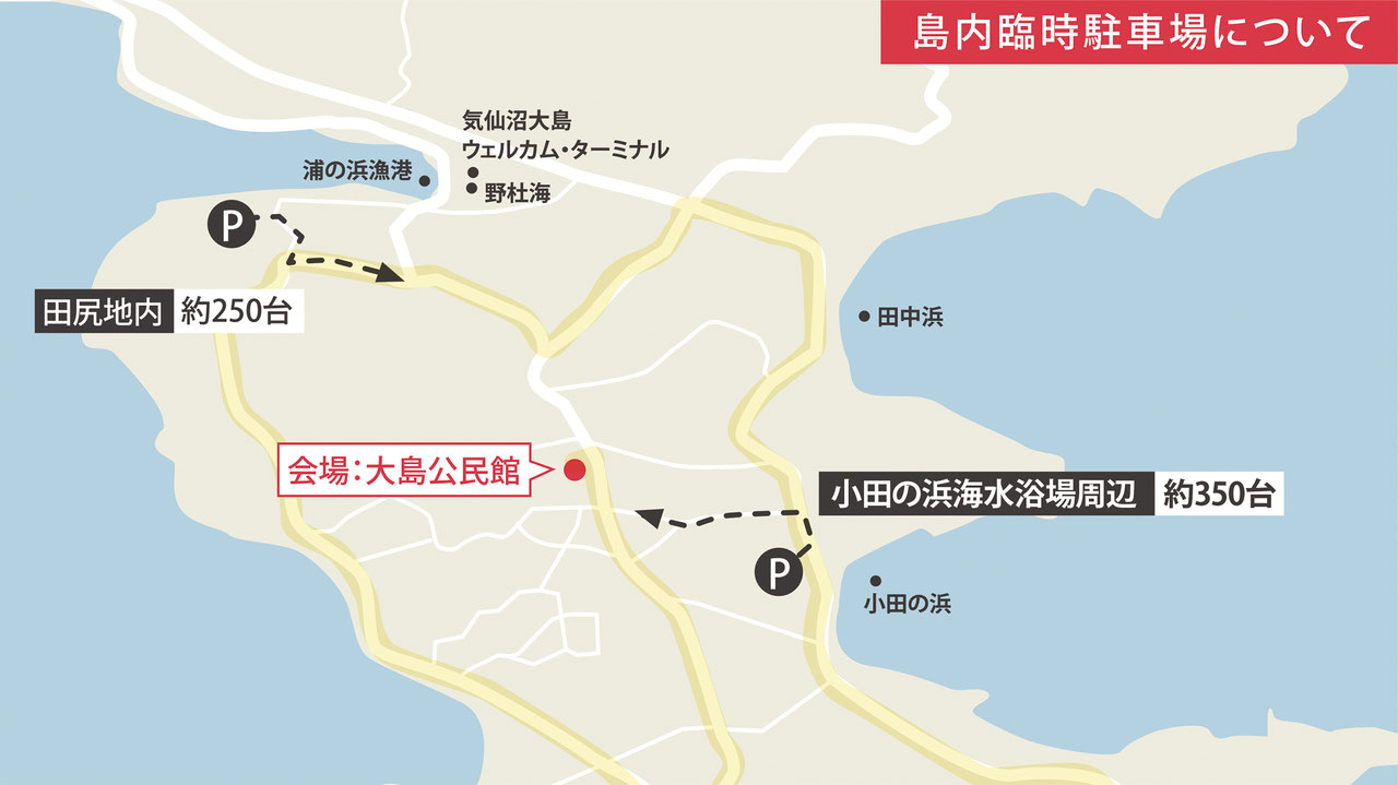 1. ที่จอดรถชั่วคราวบนเกาะโอชิมะมีดังต่อไปนี้ ที่จอดรถมีจำนวนจำกัด กรุณาใช้รถร่วมกัน ที่จอดรถทุกแห่งเปิดให้บริการตั้งแต่เวลา 7:00 น. ถึง 14:00 น. ในวันจัดงาน